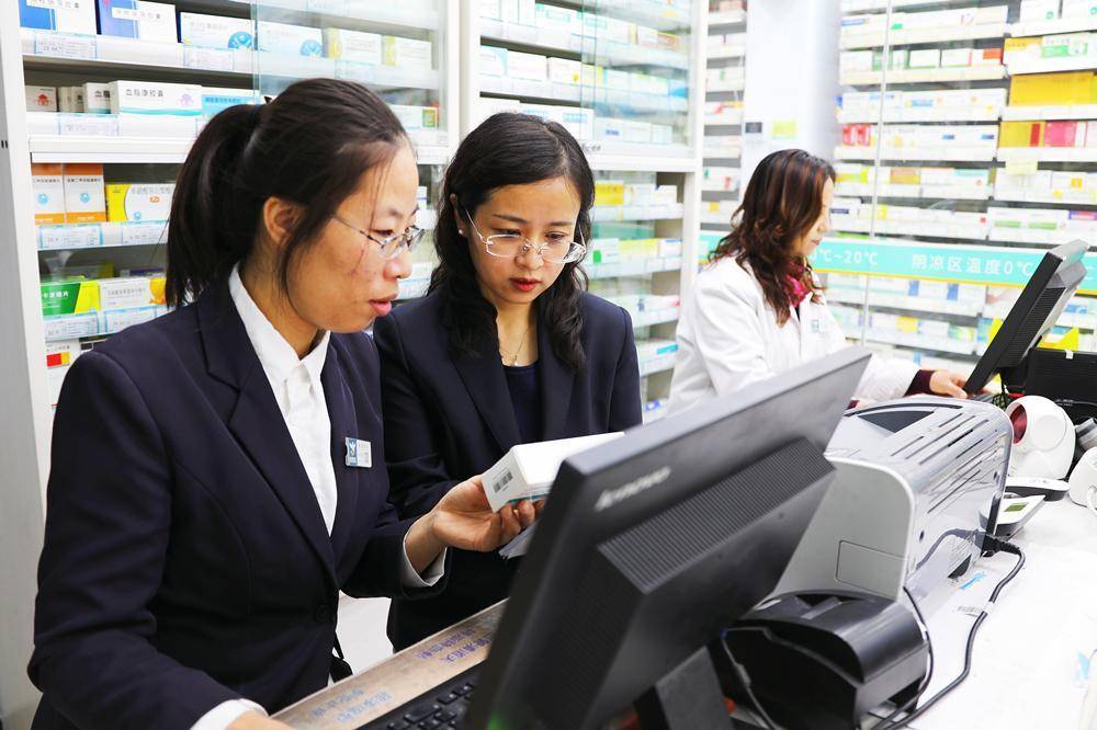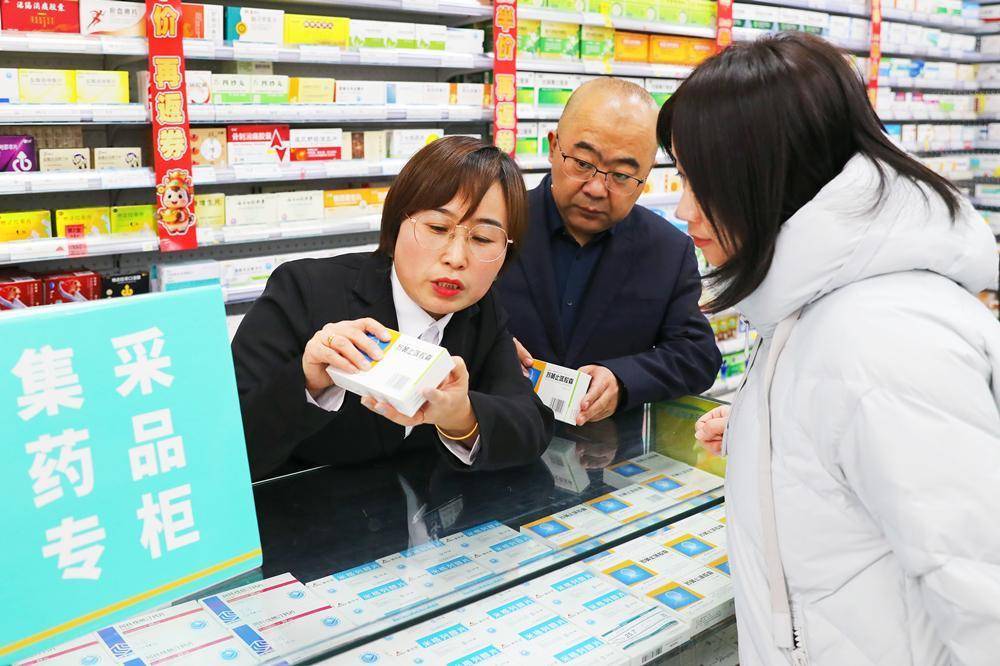 张家口市桥东区医疗保障局工作人员(中)在了解集采药品销售情况。岑屹摄