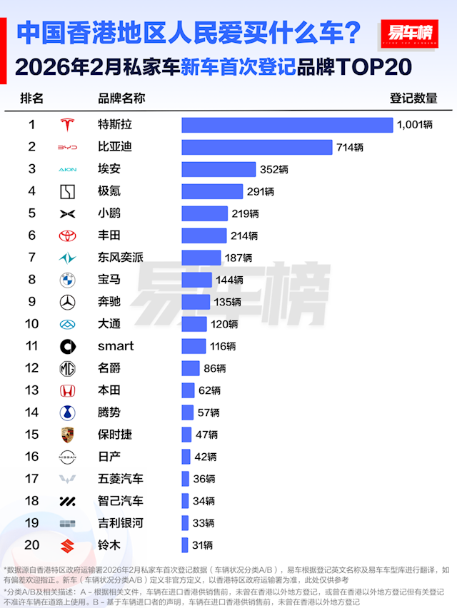 快科技3月6日消息,近日线上配资股票,易车基于香港特别行政区运输署发布的最新数据,整理发布了2026年2月中国香港地区私家车新车首次登记品牌榜单。