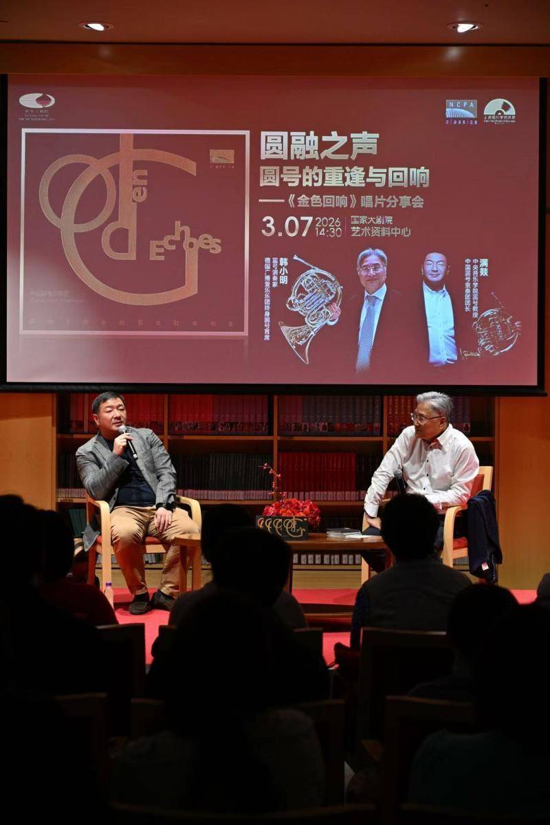 近日,圆融之声:圆号的重逢与回响——《金色回响》唱片分享会在国家大剧院举办。圆号演奏家、中央音乐学院教授、中国圆号重奏团创始人满燚,圆号演奏家、教育家、上海音乐学院教授韩小明出席活动,围绕圆号艺术的独特魅力与挑战、专辑选曲与录制背后的故事,以及古典音乐的普及与传承等议题展开深度分享。